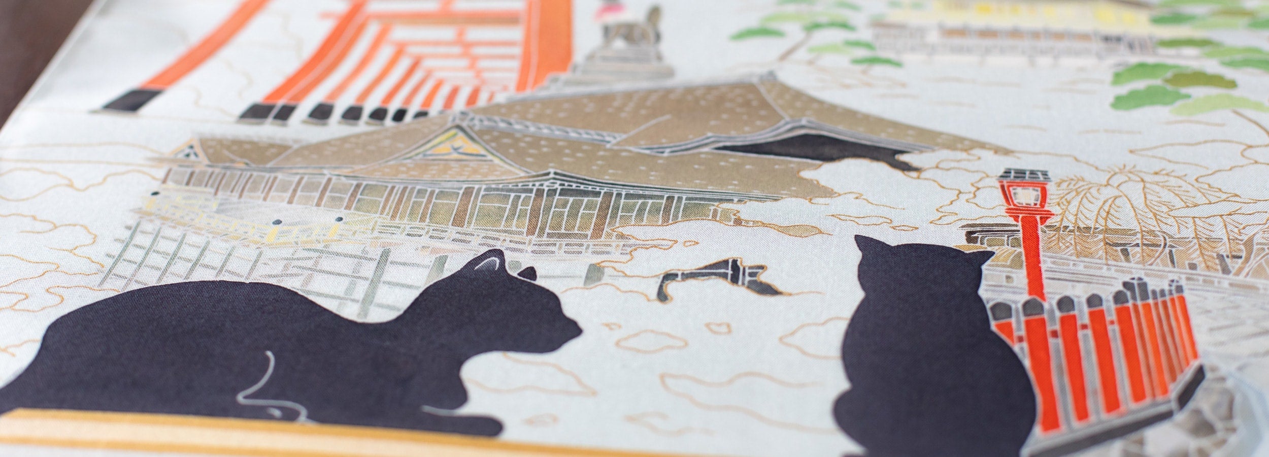 下記の作品は京都観光をしている猫というお題を頂き制作いたしました。抹茶地のタペストリーは二匹の猫たちに刺繍を施し、欄干と京都の風景にはプラチナ箔と金彩を使用しました。墨鼠地のタペストリーは、友禅で風景を描き和室に合うように誂えました。